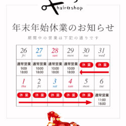 2025~2026 年末年始の営業についてのお知らせ いつもご利用いただき、また、12月のご予約のご希望のお時間に無く、 1月のご予約をしていただいたお客様ありがとうございます!! 年末年始の Read more about 2025~2026 年末年始の営業についてのお知らせ[…]