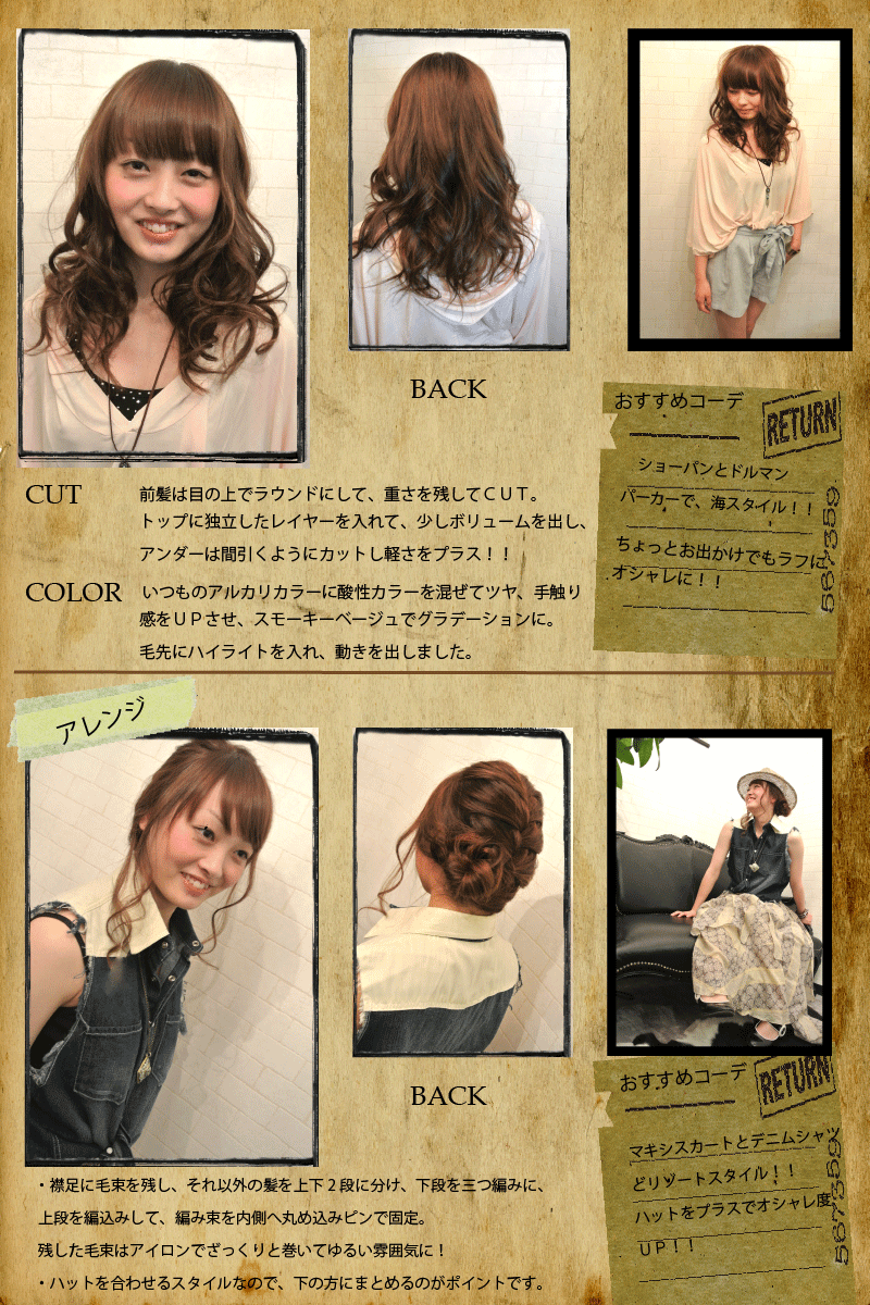 毛先にハイライトを入れ、動きを出しました。 ・襟足に毛束を残し、それ以外の髪を上下2段に分け、下段を三つ編みに、 上段を編込みして、編み束を内側へ丸め込みピンで固定。 残した毛束はアイロンでざっくりと巻いてゆるい雰囲気に! ・ハットを合わせるスタイルなので、下の方にまとめるのがポイントです。 ちょっとお出かけでもラフに オシャレに!! ショーパンとドルマン パーカーで、海スタイル!!マキシスカートとデニムシャツ どリゾートスタイル!! ハットをプラスでオシャレ度 UP!! |